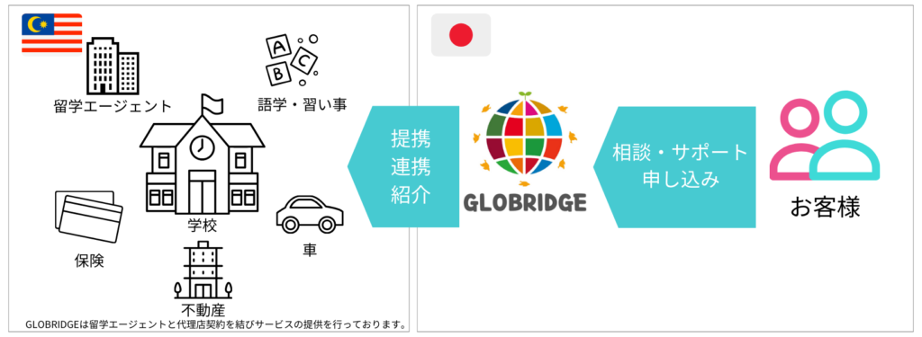 2024-07-01 GLOBRIDGEのビジネススキーム GLOBRIDGEのビジネススキーム 2023年9月26日 2024年2月5日 お客様の窓口はGLOBRIDGE(日本)にて承ります。マレーシアでのお客様対応は業務提携・連携・紹介の上、サービスの提供を行います。GLOBRIDGEのビジネススキーム